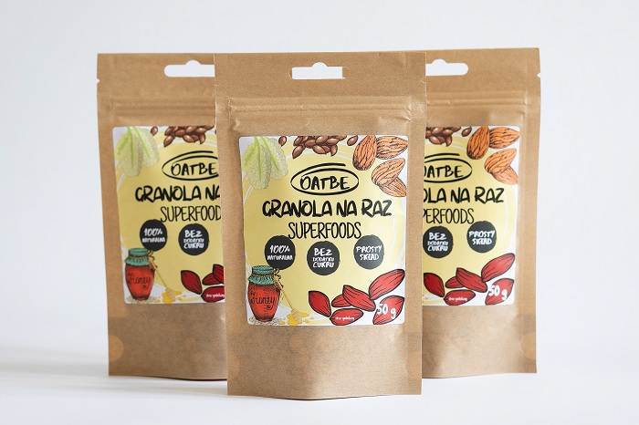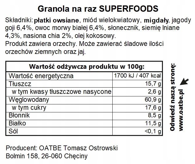 Granola to mieszanka pełnoziarnistych płatków owsianych oraz pysznych i zdrowych dodatków. Swój słodki smak zawdzięcza wyjątkowemu składnikowi – polskiemu, naturalnemu miodowi wielokwiatowemu. Wszystkie te elementy są łączone w całość a następnie zapiekane, co sprawia że granola uzyskuje doskonały smak i  chrupką konsystencję.
